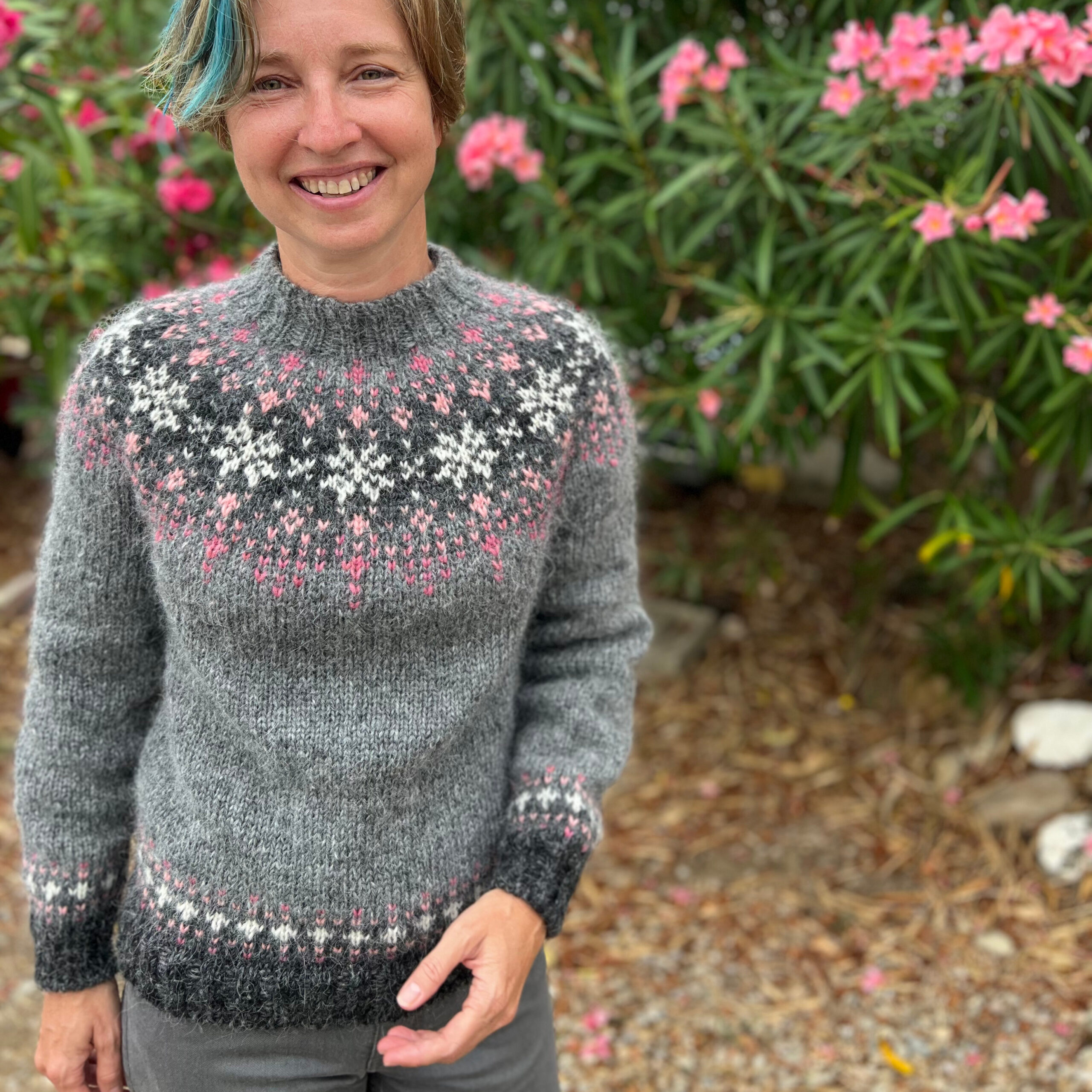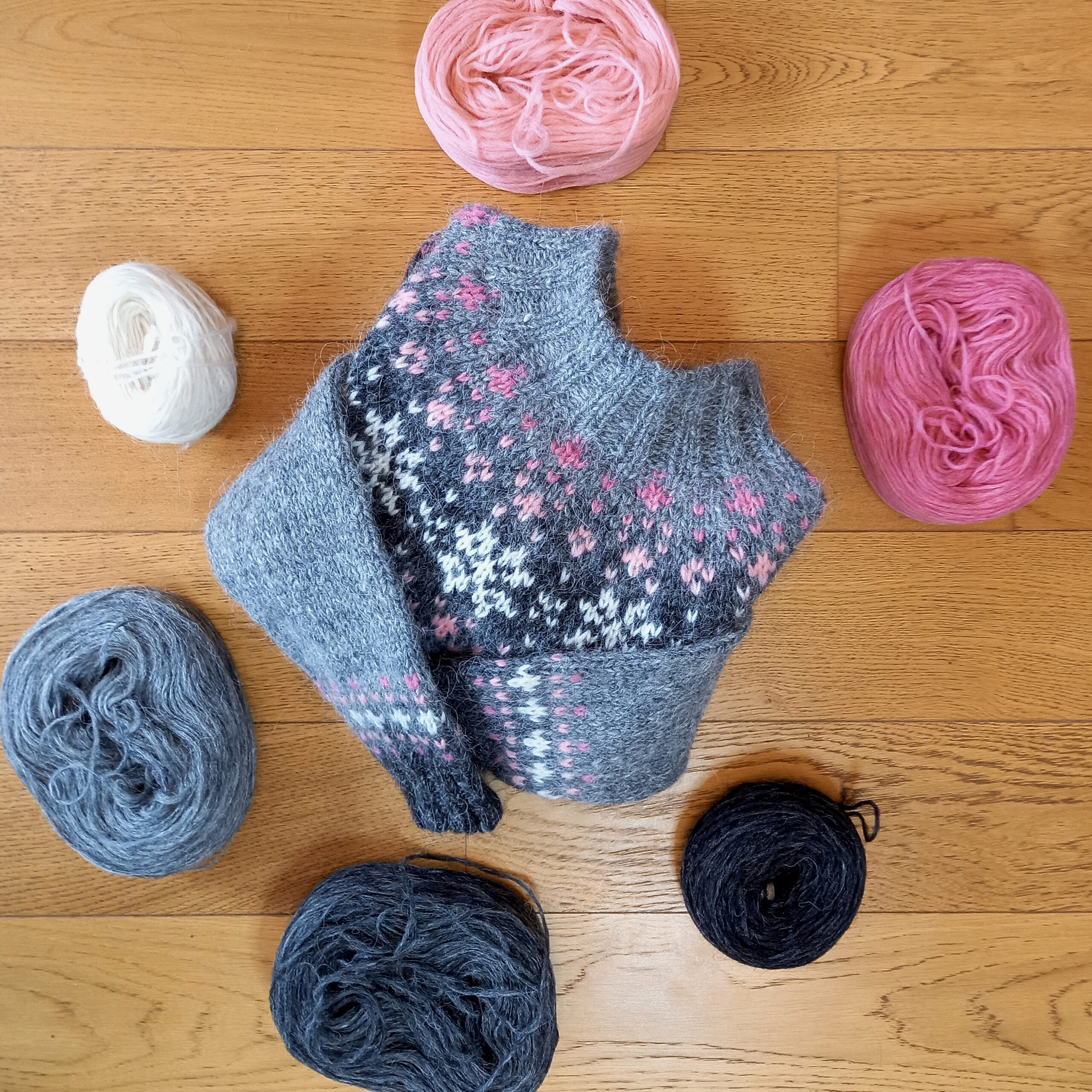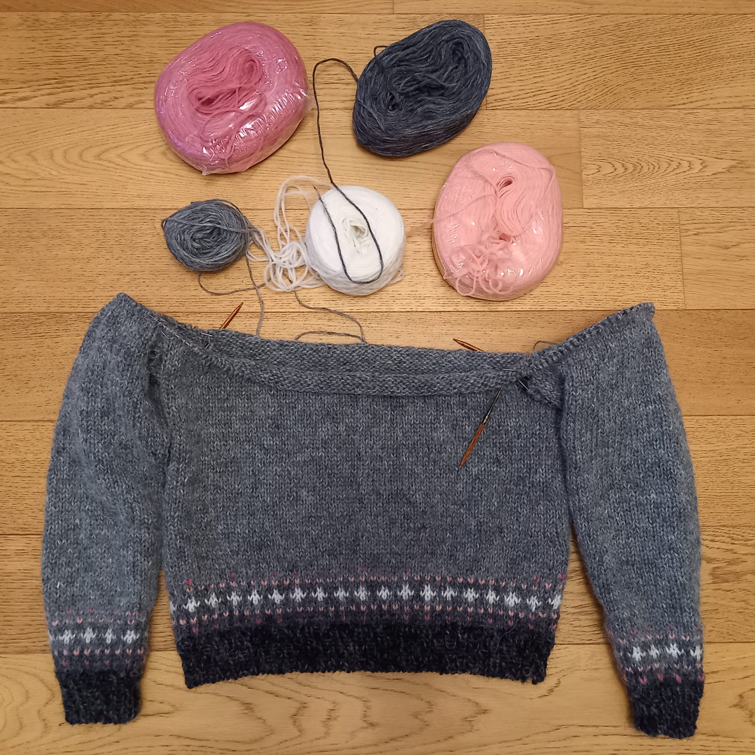 This sweater uses 6 different colors, 3 shades of grey for the body and the pattern background, and 2 pinks and the white for the pattern itself.