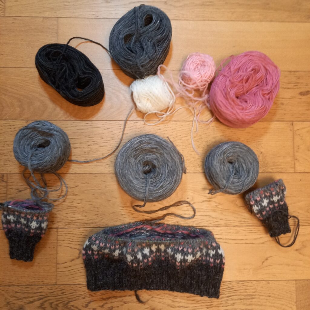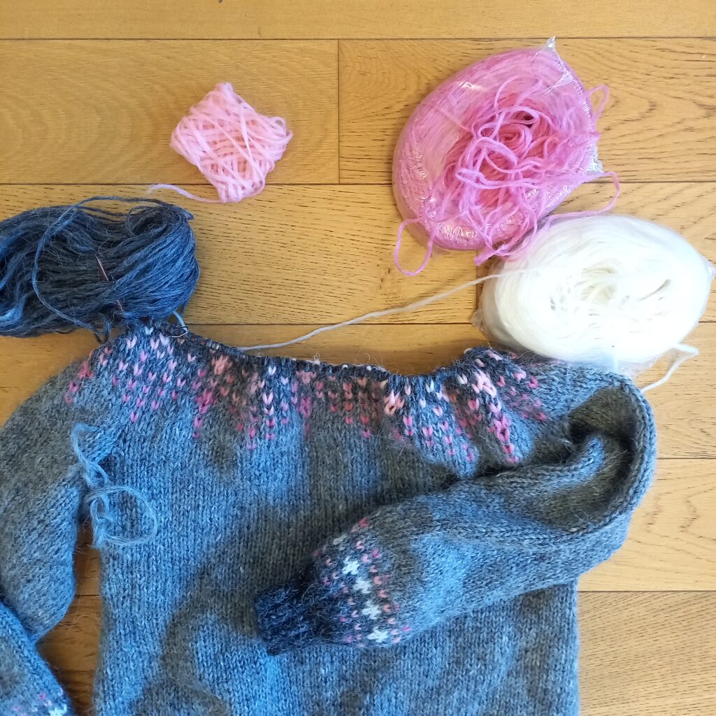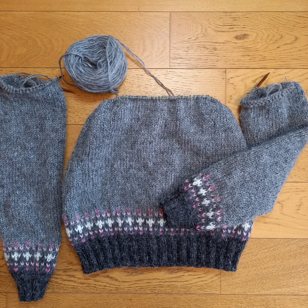 The colorwork from the yoke starts here. It contains decreases, hidden in the pattern, to go from shoulder-width to collar-width.