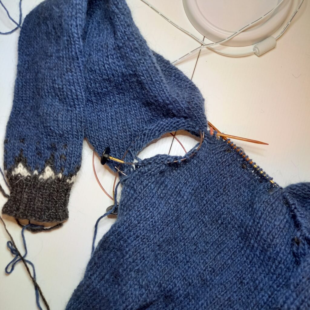 The sleeves are knitted in the round, the body is also knitted in the round.