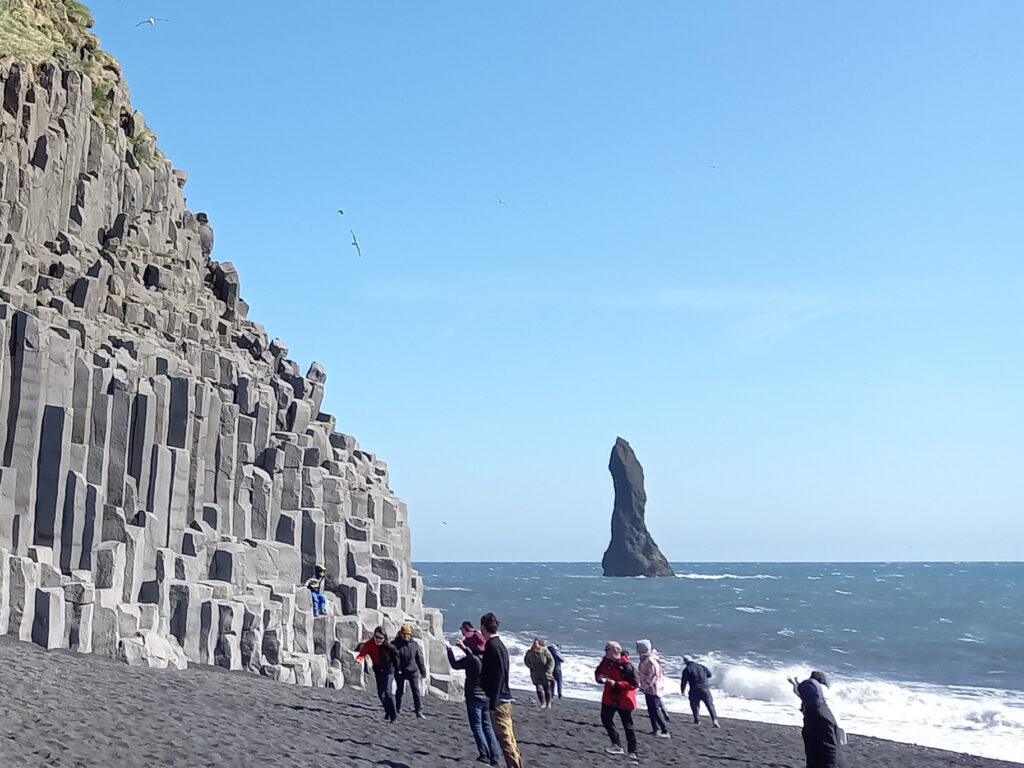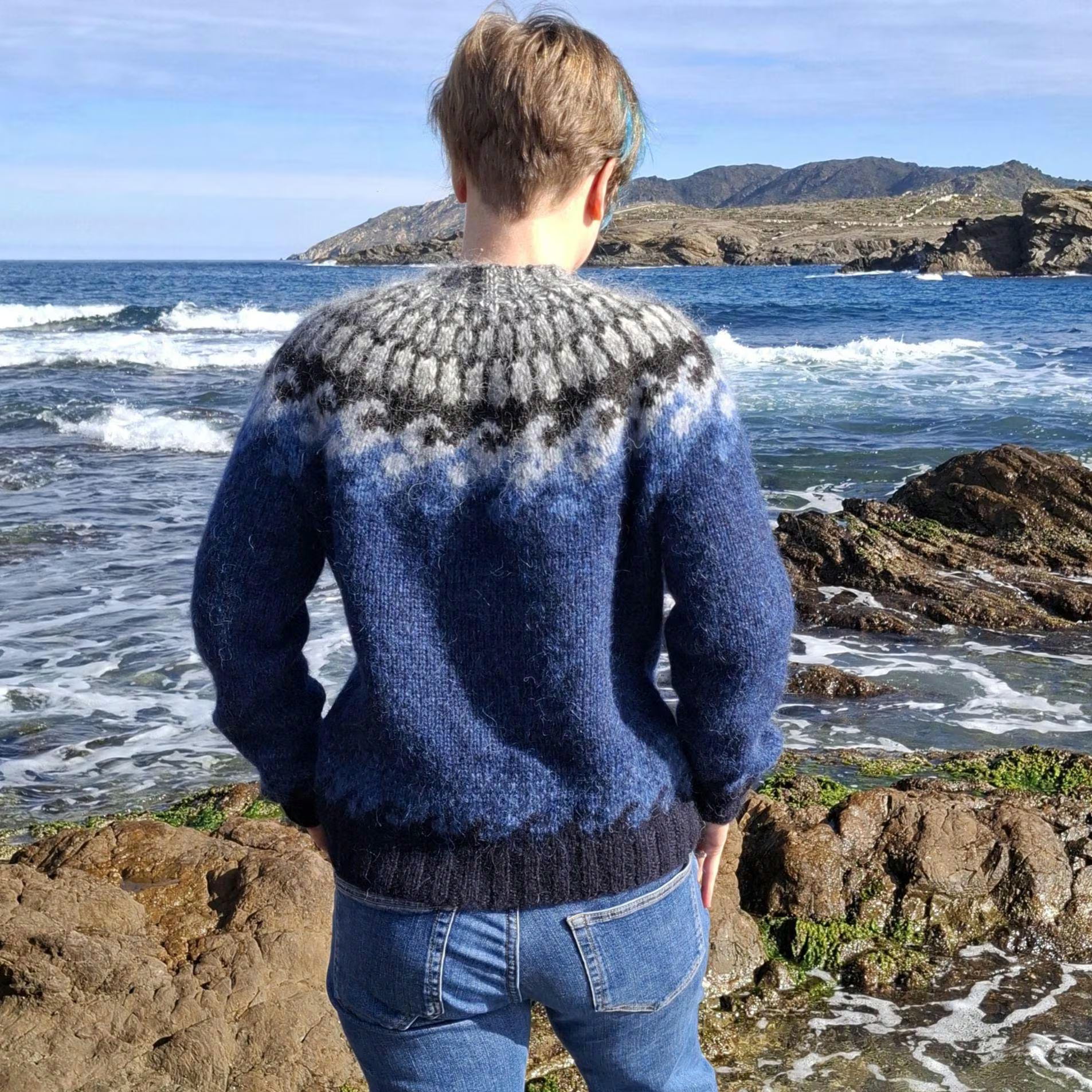 This sweater uses 4 different shades of blue to render the sea waves, and 4 more for the sun playing on the grey basalt columns.